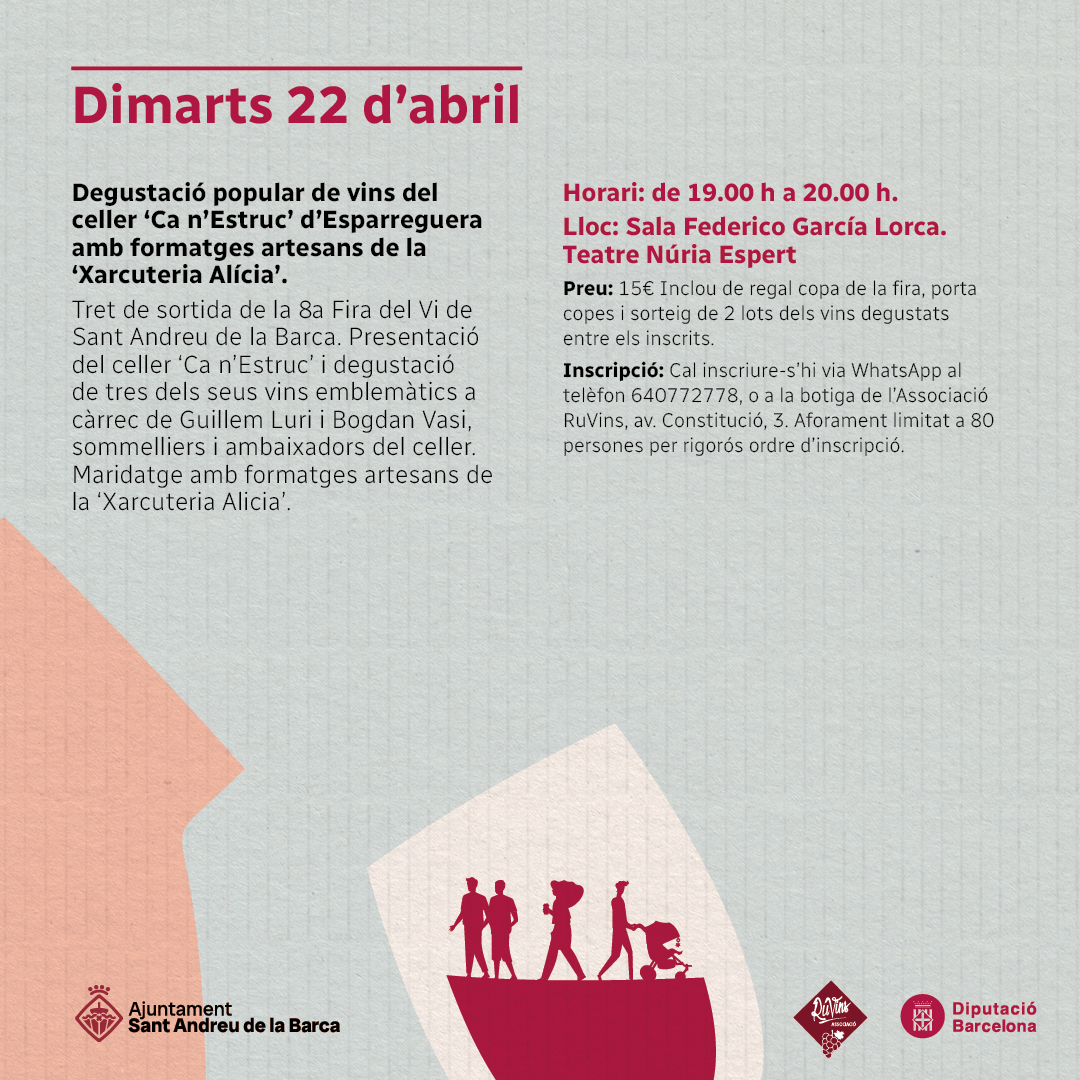 Inscripció: Cal inscriure-s’hi via WhatsApp al telèfon 640772778, o a la botiga de l’Associació RuVins, av. Constitució, 3. Aforament limitat a 80 persones per rigorós ordre d’inscripció.