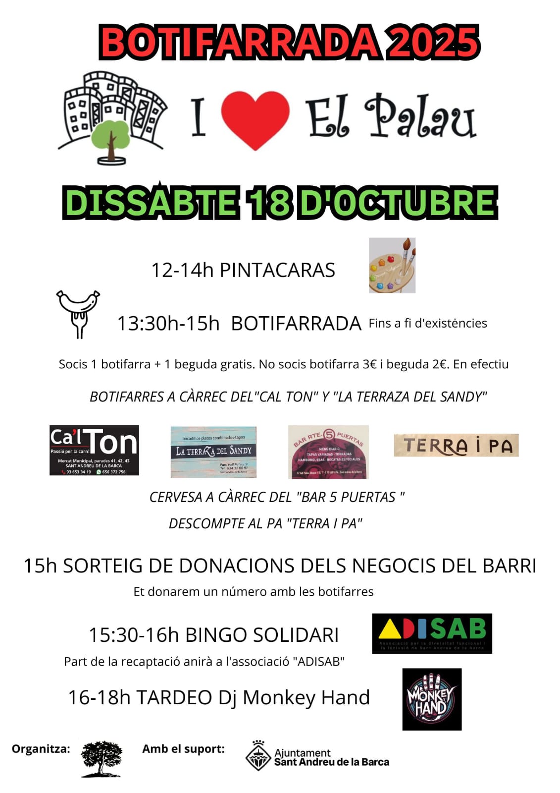 Com és habitual oferirem una tradicional botifarrada, amb un bingo solidari a càrrec de l'associació local ADISAB i un vespreig per finalitzar la jornada