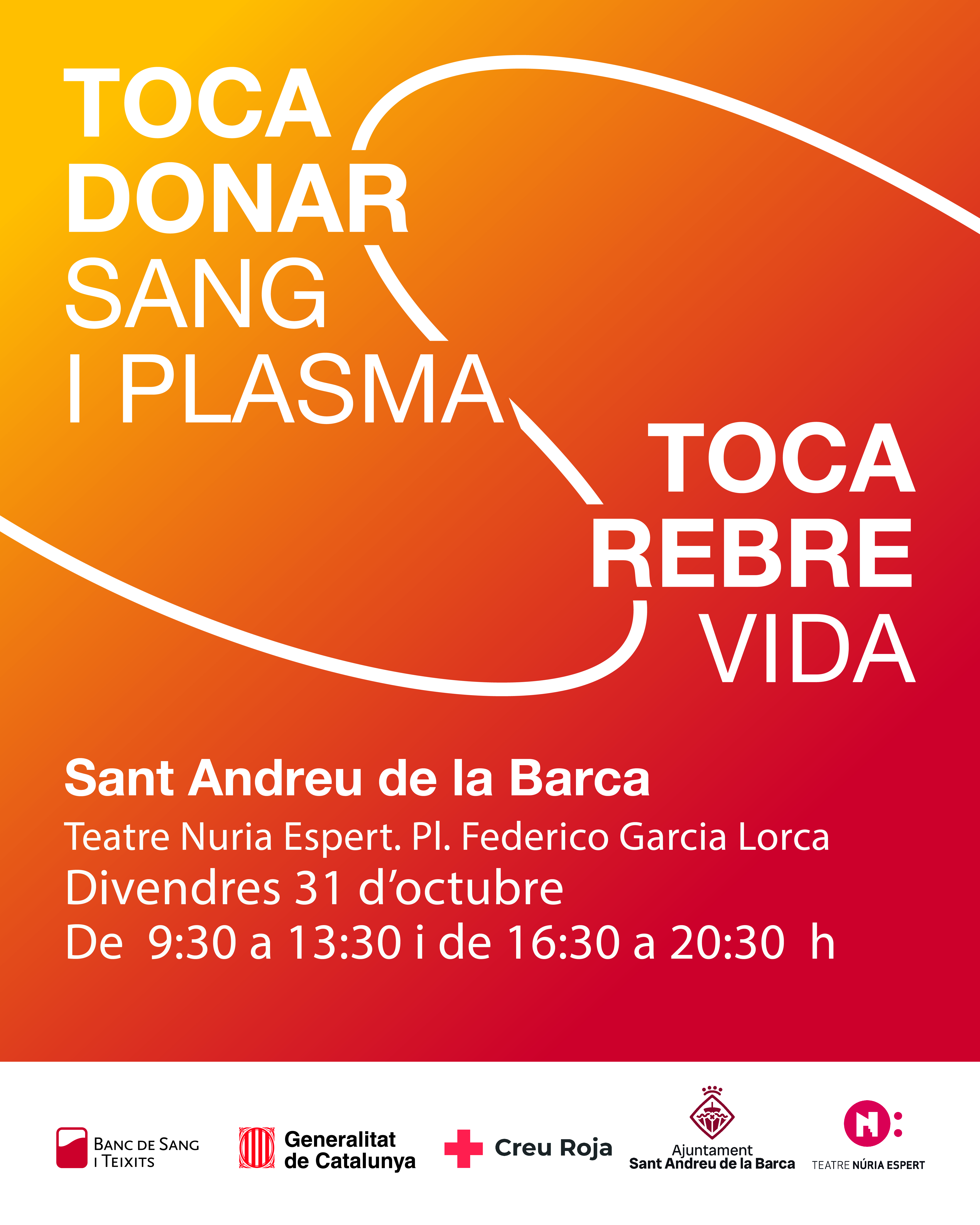 Aquest divendres 31 d'octubre de 9:30h a 13:30 i de 16:30h a 20:30, es torna a organitzar una recollida de sang i plasma amb el Banc de Sang i Teixits de Catalunya al Teatre Núria Espert, a la Pl. Federico García Lorca.