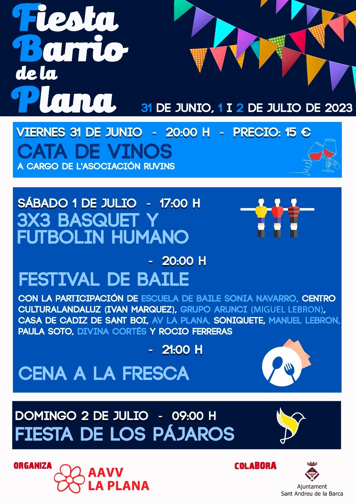 Amb motiu de la Festa del Barii de la Plana, es realitzarà un festival de ball. COmptaran amb la participació de Escuela de Baile Sonia Navarro, el Centro Cultural Andaluz (Ivan Marquez), Grupo Arunci (Miguel Lebron), Casa de Cadiz de Sant Boi, Av La Plana, Soniquete, Manuel Lebron, Paula Soto, Divina Cortés i Rocio Ferreras.