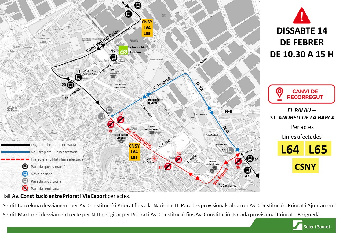 Dissabte 14 de febrer de 10.30 a 15.00 h, es modifica el recorregut habitual a Av. Constitució de Sant Andreu de la Barca amb l'anul·lació provisional de les parades afectades de les línies: L64, L65, CSNY