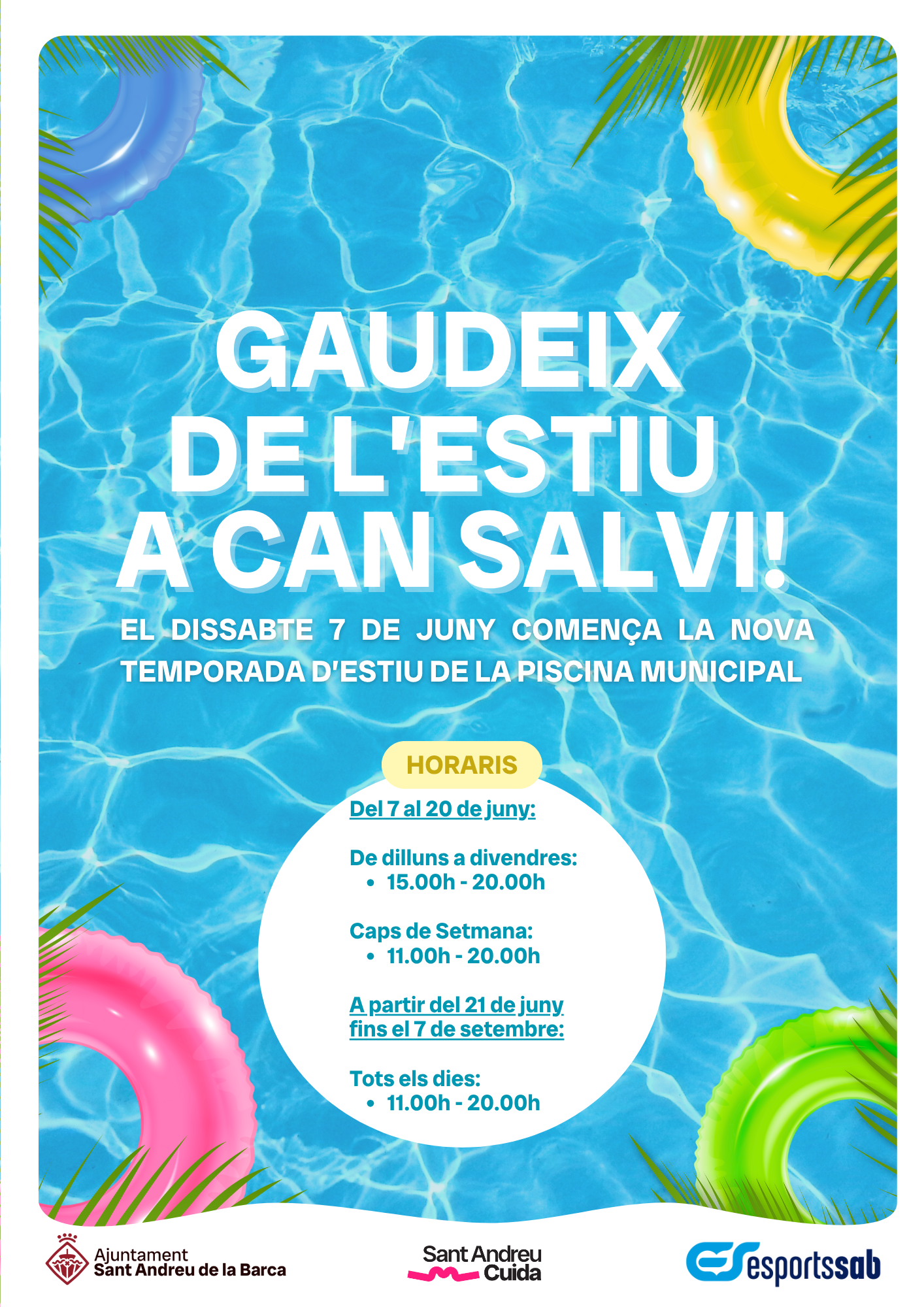 A partir del dissabte 7 de juny, i fins al 7 de setembre, s'obre la piscina municipal d'estiu que es troba a les instal·lacions esportives de Can Salvi. L'horari d'obertura de la piscina serà inicialment del 7 al 20 de juny, de dilluns a divendres, en horari de 15:00 hores a 20:00 hores, i els caps de setmana d'11:00 hores a 20:00 hores.