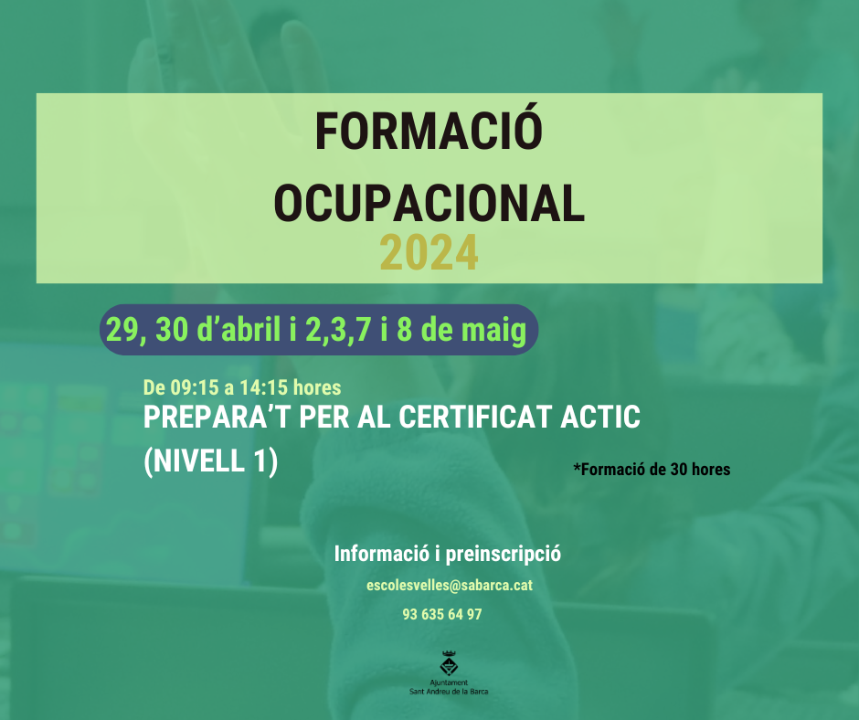Curs que ofereix l'Ajuntament de Sant Andreu de la Barca per millora de feina i empreses. Inscripcions trucant al 93 635 64 07 o escrivint un correu electrònic a escolesvelles@sabarca.cat