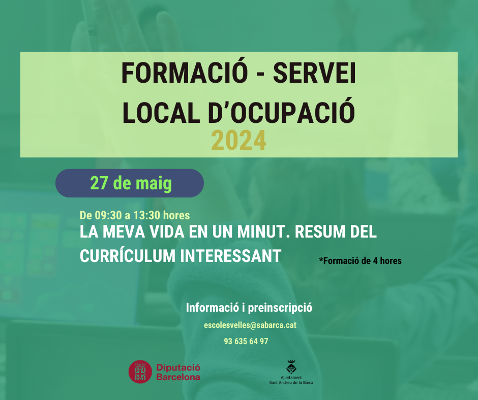 Curs que organitza la Diputació de Barcelona i l'Ajuntament de Sant Andreu de la Barca per millora de feina i empreses. Inscripcions a l'abril trucant al 93 635 64 07 o escrivint un correu electrònic a escolesvelles@sabarca.cat