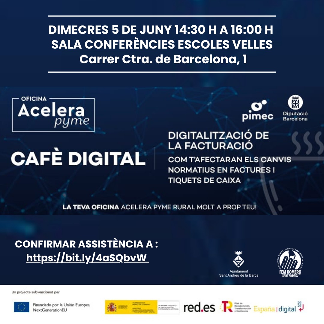 L'Agrupació de Comerç i Serveis de Sant Andreu de la Barca (Acssab) organitzen (en col·laboració amb l'Ajuntament i impartit per Pimec Comerç), una jornada sobre el nou reglament de facturació Electrònica que afecta els autònoms i que entrarà en vigor l'1 de juliol de 2025. També s'explicarà en detall que consisteix l'ajuda Kit Digital, les diferents tecnologies disponibles en aquest ajut i com accedir a la seva sol·licitud. També com des de l'Oficina Accelera Pime Rural del Baix Llobregat et podem ajudar.