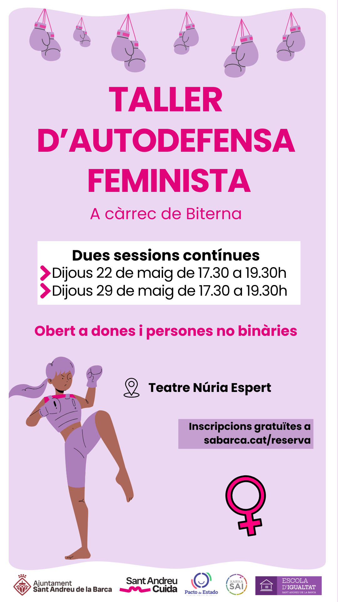 El dijous 29 de maig al Teatre Núria Espert es durà a terme la segona sessió del taller d'autodefensa feminista a càrrec de Biterna obert a dones i persones no binàries. Igual que l'anterior sessió, l'horari serà de les 17.30 h fins a 19.30 h.