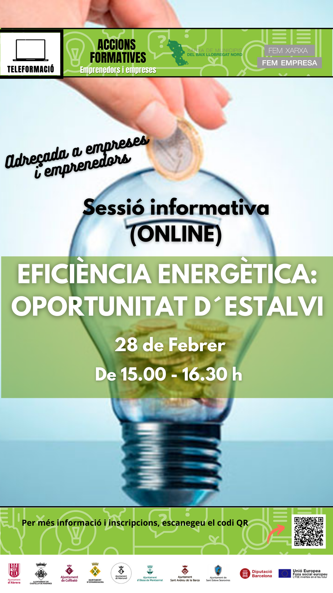 La propera sessió informativa adreçada empreses i emprenedors, "Eficiència energètica: oportunitat d'estalvi"que es realitza en format online el proper 28 de febrer de 2023, de 15.00 a 16.30 h.