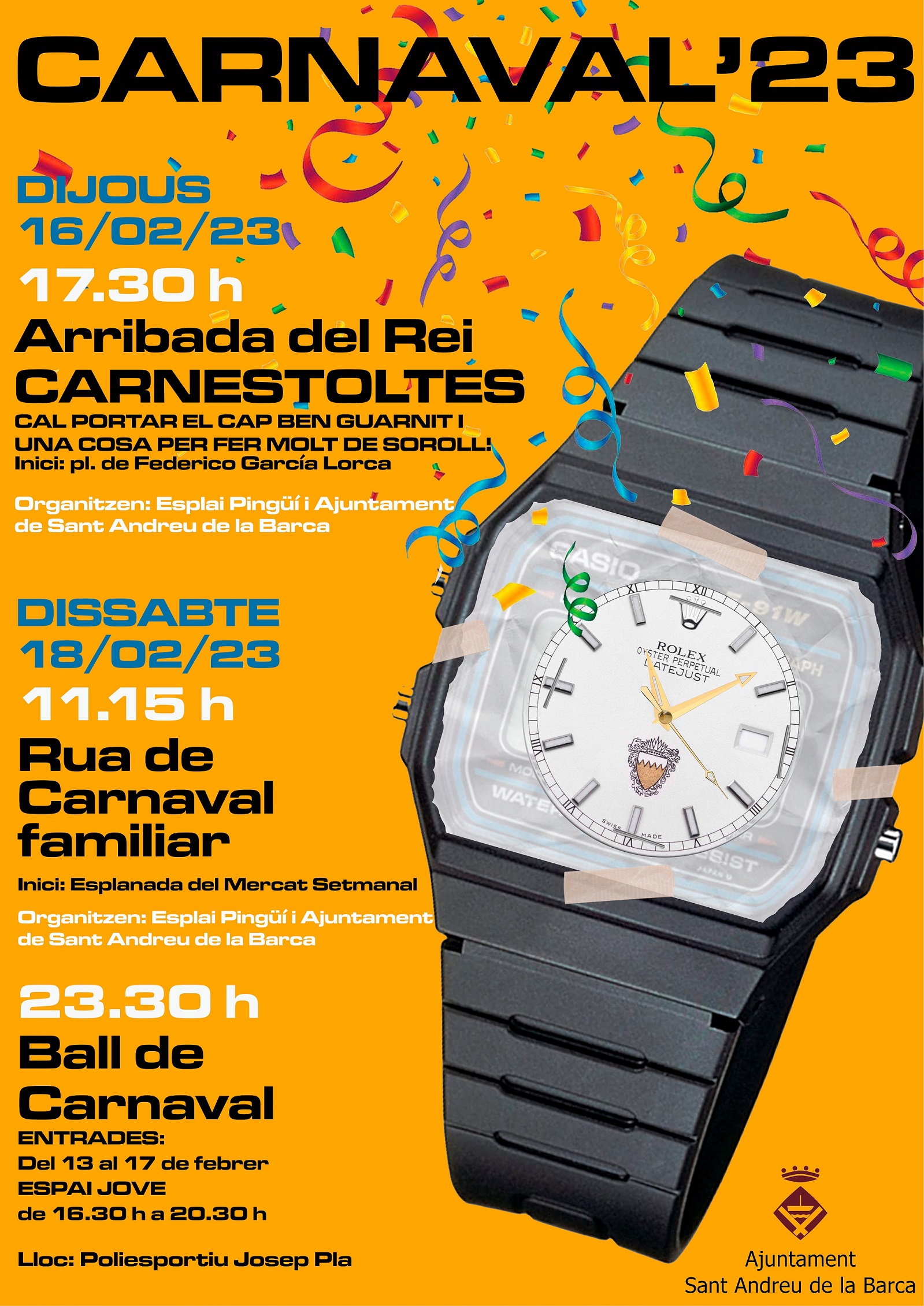 El rei carnestoltes arribarà a la Plaça Federico Garcia Lorca. Cal portar el cap ben guarnit i una cosa per fer molt de soroll
