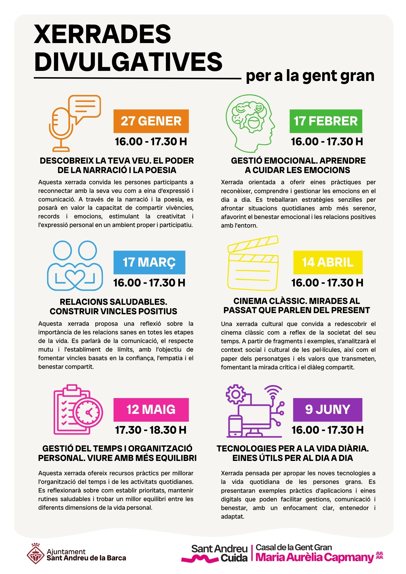 Aquesta és la segona edició del cicle que va estrenar-se l’any passat i que enguany es consolida a Sant Andreu amb una programació de conferències renovada. Totes les xerrades tindran lloc al Casal de la Gent Gran (passeig de la Generalitat, 0) i estan obertes a tota la ciutadania sense necessitat de ser usuària habitual dels serveis del casal.