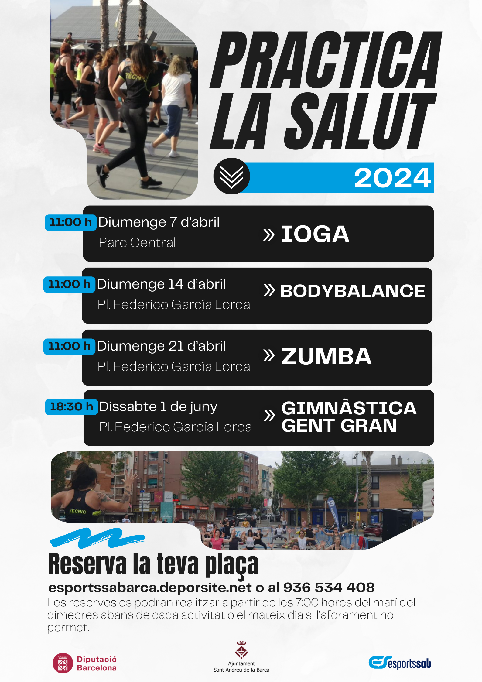 Aquest mes d'abril i dissabte 1 de juny, torna a Sant Andreu de la Barca el programa "Practica la salut". Una iniciativa promoguda per les regidories de Salut Pública i Esports i Activitat Física amb l'objectiu de promoure i fer visible les activitats físiques saludables per a tothom. És per això que s'han programat 4 activitats dirigides al carrer, dutes a terme per tècnics esportius d'Esportssab de manera que qualsevol persona es pugui incorporar de forma espontània. Totes 4 són gratuïtes i obertes a la ciutadania.
