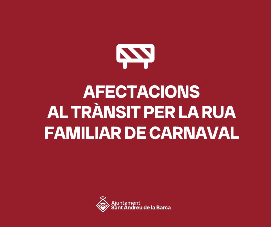 Aquest dissabte, 14 de febrer, Sant Andreu de la Barca celebra el Carnestoltes amb la Rua Familiar de Carnaval, que tindrà lloc a partir de les 11.30 h del matí i tindrà el següent recorregut: Sortida des de l'esplanada del mercat setmanal - av. Constitució - via de l’Esport - passeig del Parlament - carrer Catalunya - carrer Doctor Fleming - via de l’Esport - avinguda Constitució - arribada a l'esplanada del mercat setmanal.