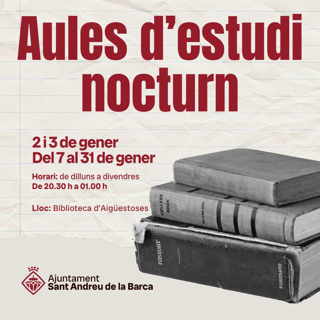El 2 i 3 de gener i del 7 de gener i fins al 31 de gener es tornen a habilitar les aules d’estudi nocturnes a la Biblioteca Aigüestoses per oferir als alumnes de Sant Andreu de la Barca un espai adequat, tranquil i preservat de soroll on poder preparar els seus exàmens.