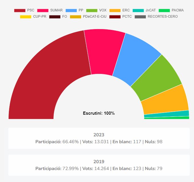 Amb aquestes dades, el PSC supera amb escreix els resultats obtinguts el 2019 on va aglutinar el 30,91% dels votants i 4.385 vots. En segon lloc, Sumar ha aconseguit el suport del 15,25% dels vots amb 1.973 paperetes.
