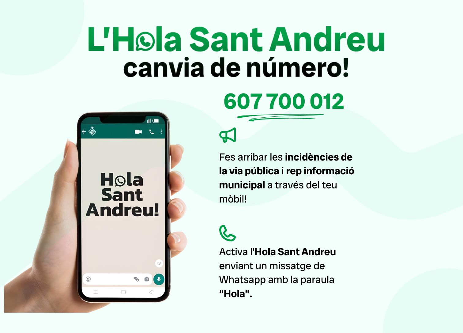 Per tornar a activar el servei “Hola Sant Andreu” només cal enviar un WhatsApp al nou número 607 700 012 amb la paraula “Hola”. Un cop enviat, la persona rebrà un missatge de confirmació per començar a utilitzar totes les funcionalitats del servei. També es pot accedir al servei directament fent clic al següent enllaç: HOLA SANT ANDREU