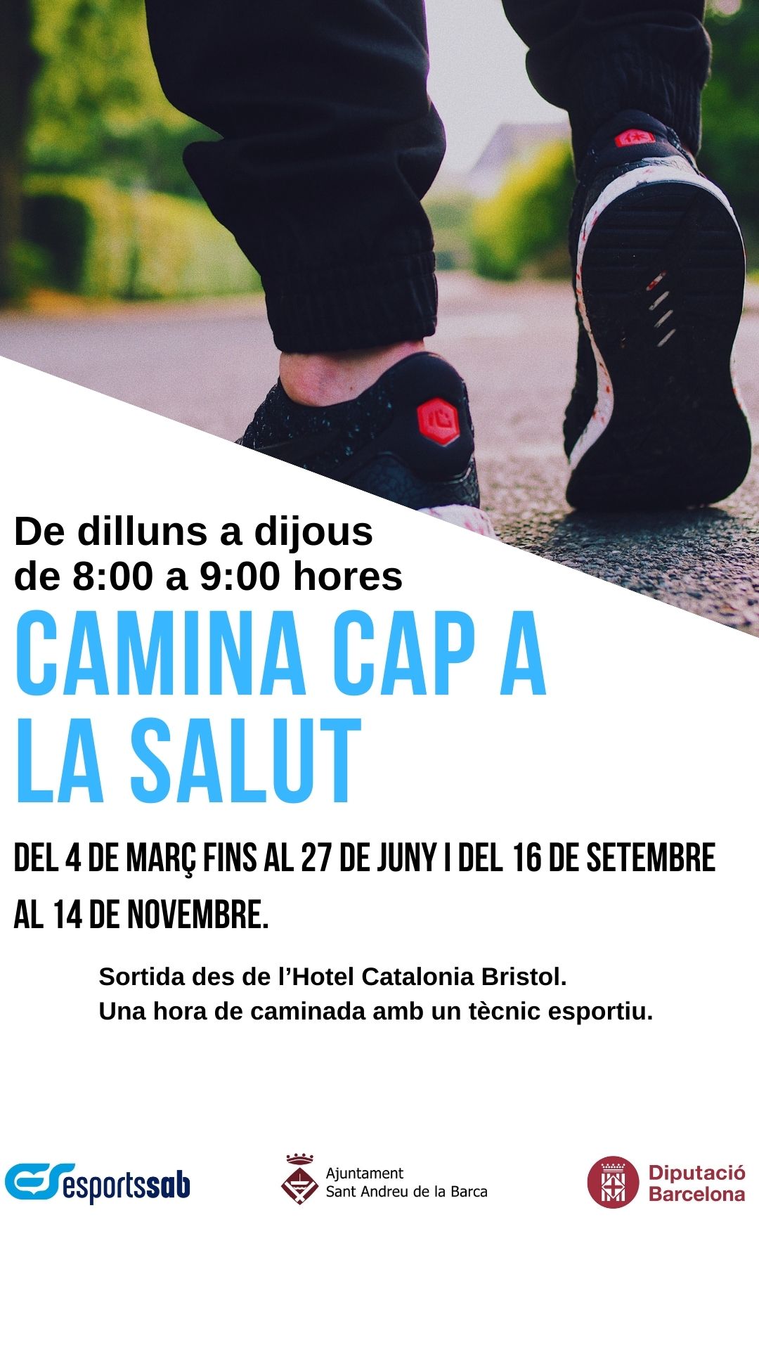 A partir del pròxim dilluns 4 de març, l'Ajuntament de Sant Andreu de la Barca torna a posar en marxa el programa gratuït de caminades grupals ''Camina cap a la salut'' per a promoure l'activitat física entre els veïns i veïnes del municipi. Dins d'aquest programa, s'organitzen 4 rutes setmanals, d'una hora de durada cadascuna, a peu per la ciutat. Unes caminades on els participants estaran acompanyats i guiats per un monitor esportiu especialitzat. Aquesta activitat, organitzada per l'Ajuntament i Esportssab, es durà a terme de dilluns a dijous de 8 a 9 h i es mantindrà fins al 27 de juny.