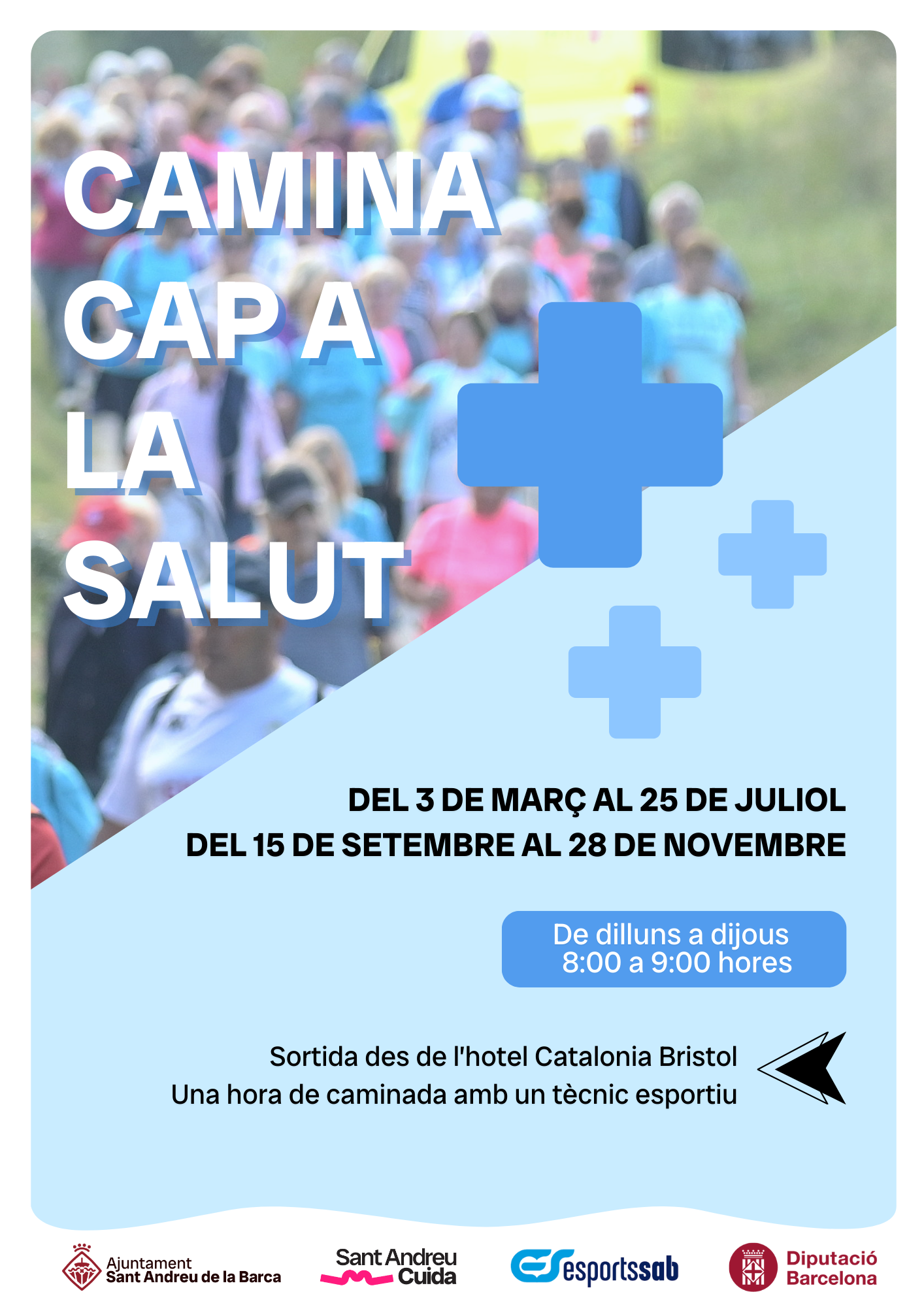 A partir del pròxim dilluns 3 de març, l'Ajuntament de Sant Andreu de la Barca torna a posar en marxa el programa gratuït de caminades grupals ''Camina cap a la salut'' per a promoure l'activitat física entre els veïns i veïnes del municipi. Dins d'aquest programa, s'organitzen 4 rutes setmanals a peu, d'una hora de durada cadascuna, per la ciutat. Unes caminades on els participants estaran acompanyats i guiats per un monitor esportiu especialitzat.
