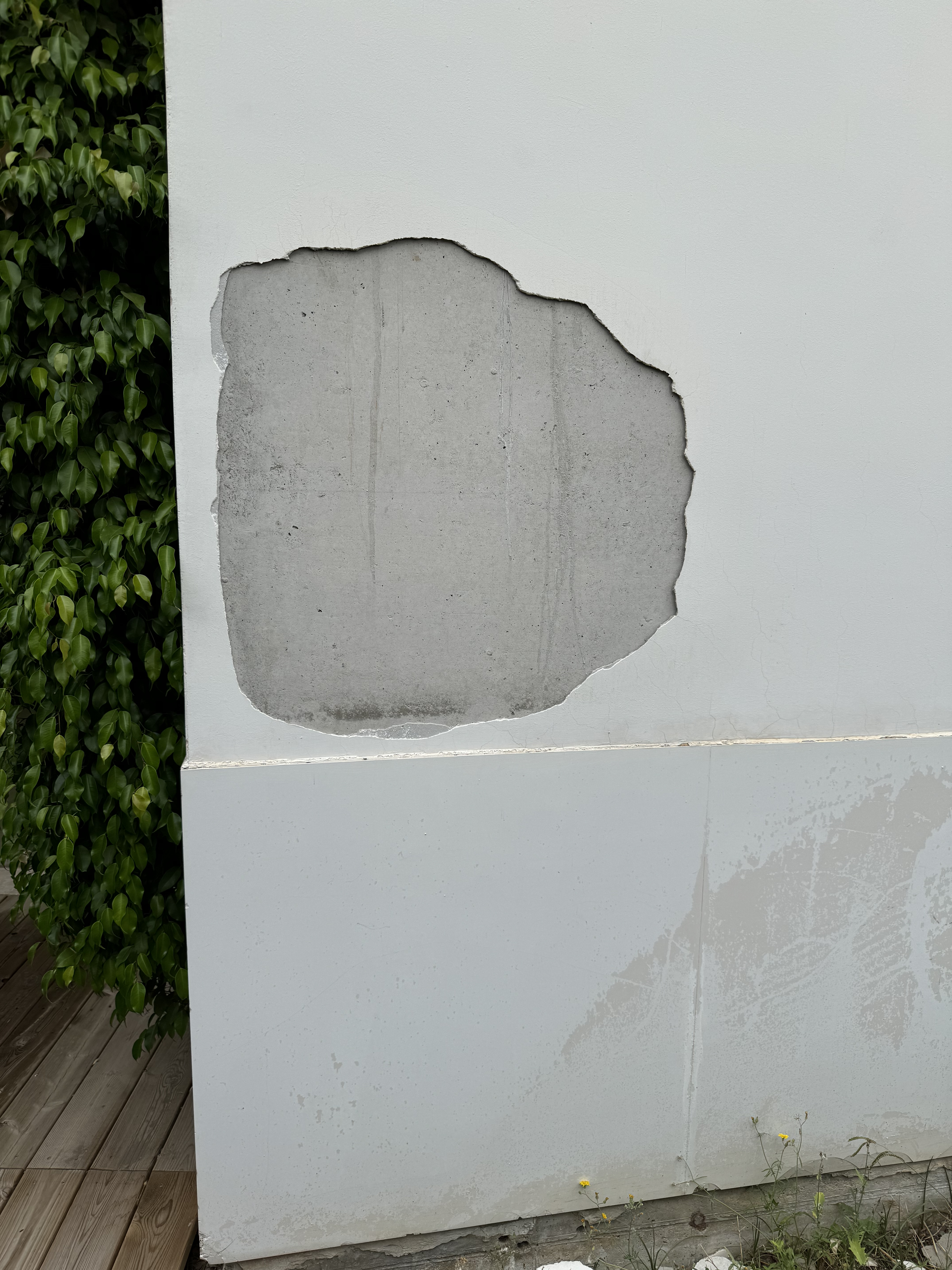 - Sanejat de trams petits de morter bufat de façana, que preveu el repicat, retirada de runa, aplicació de pont d'unió, i posterior aplicació de morter de calç, acabat lliscat fi.