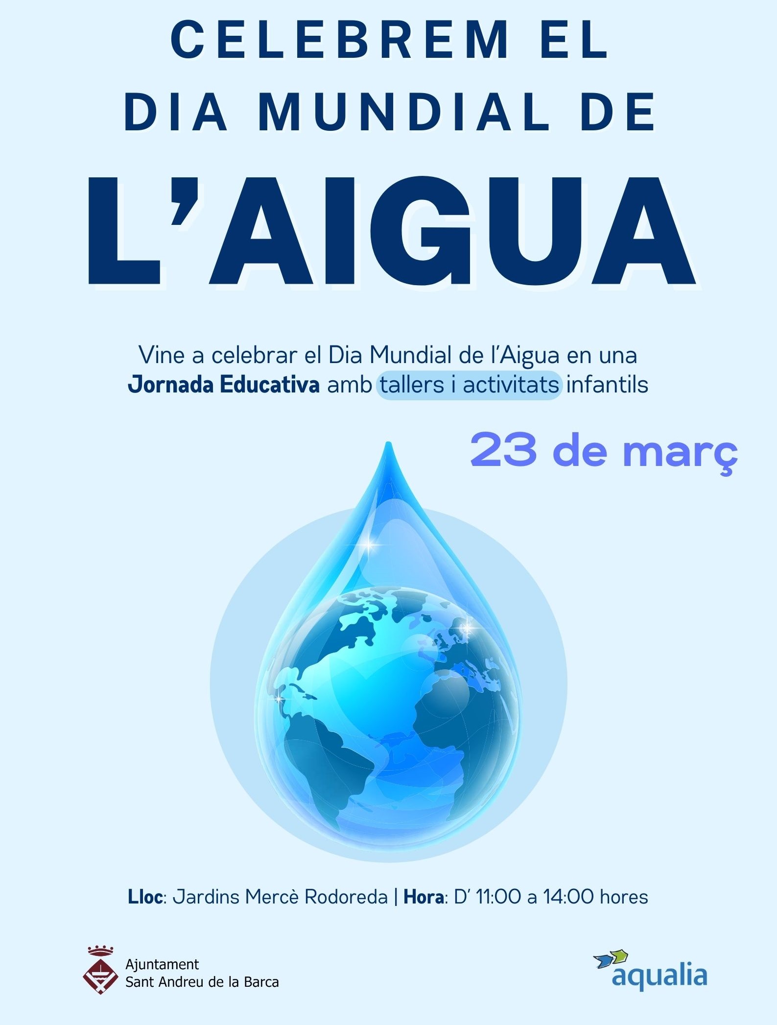 Aquest dissabte 23 de març, Sant Andreu de la Barca commemora el Dia Mundial de l'Aigua, celebrat el 22 de març, amb una gran festa educativa infantil organitzada per Aqualia, en col·laboració amb l'Ajuntament. S'han programat tallers lúdico-didàctics i activitats infantils en família per conscienciar als més petits sobre la importància de fer un ús responsable de l'aigua mentre es diverteixen. La jornada tindrà lloc als Jardins Mercè Rodoreda, d'11:00 a 14:00 hores.