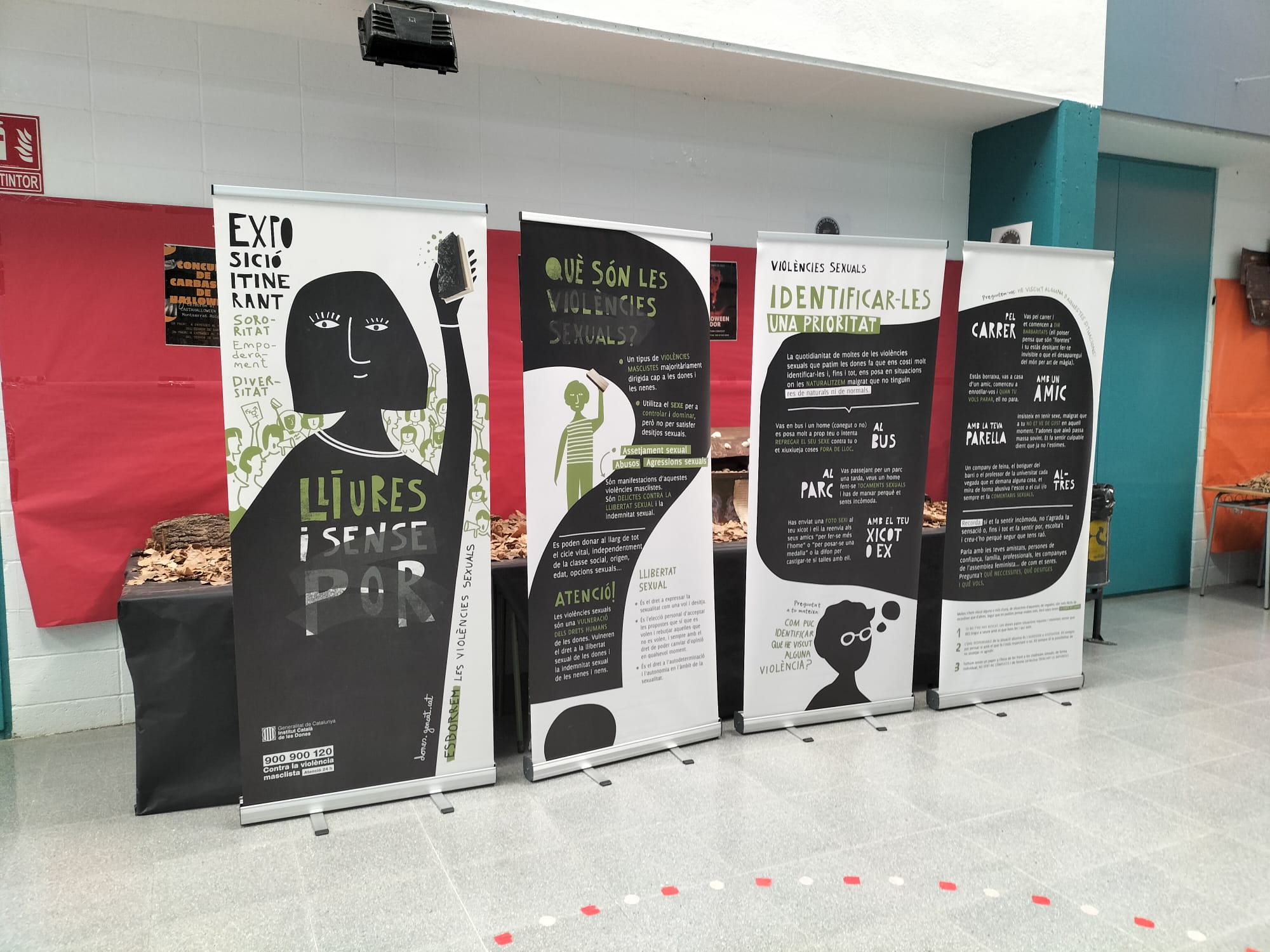 'Lliures i Sense Por' és una exposició de 9 plafons pensada com a recurs formatiu per reflexionar sobre què són les violències sexuals, com identificar-les, quines són les causes, i què es pot fer davant situacions de violència.