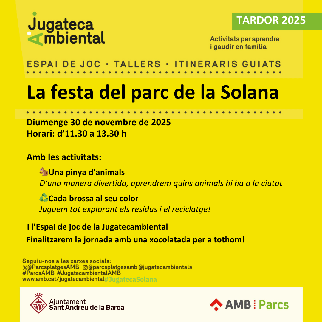 Aquest proper diumenge, 30 de novembre, se celebra la Festa del Parc de la Solana en el marc de la Setmana de la Prevenció de Residus i la Festa Major d’Hivern de Sant Andreu de la Barca. A les 11.30 h tindrà lloc una xocolatada a la plaça Mercè Rodoreda i a partir de les 12.00 h començaran les activitats familiar de la Jugatecambiental. L’activitat “Una pinya d’animals” ensenyarà d’una manera divertida quins animals hi ha a la ciutat, mentre que amb el taller “Cada bossa al seu color” s’explorarà el reciclatge.