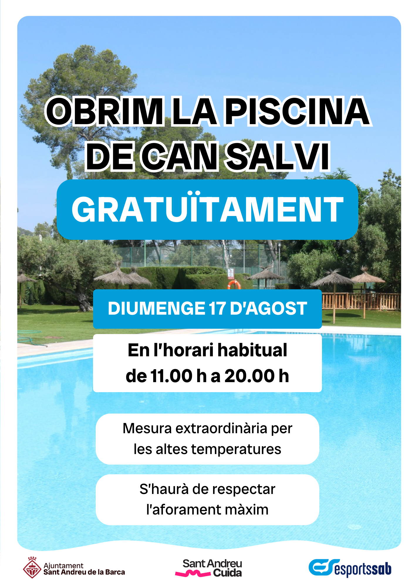 Davant les altes temperatures i l’onada de calor dels darrers dies, l’Ajuntament de Sant Andreu de la Barca obrirà aquest diumenge 17 d’agost la piscina municipal de Can Salvi de forma gratuïta.
