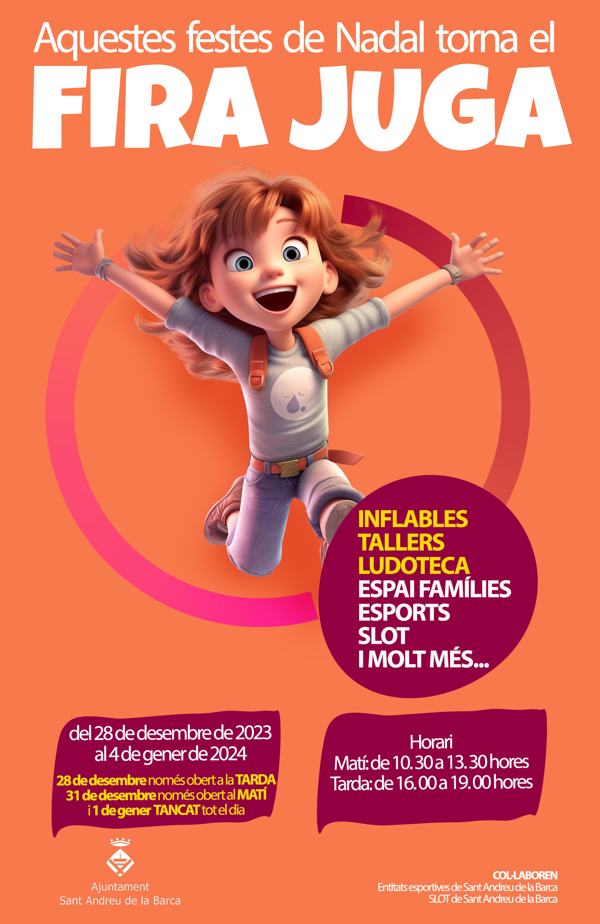 Del 28 de desembre al 4 de gener hi haurà aquesta fira infantil plena de jocs, inflables i tallers per a infants de 0 a 12 anys. El servei es realitzarà amb monitors i monitores titulats i amb la col·laboració d’entitat esportives locals i l’associació lúdica Club SLOT Sant Andreu de la Barca. L’entrada al FiraJuga és gratuïta i en horari general de 10.30 a 13.30 h en torn de matí i de 16 a 19 hores en torn de tarda. Com a horaris especials, el dijous 28 de desembre estarà obert només a la tarda i el 31 de desembre només en torn de matí. L’1 de gener, primer dia de l’any i festiu, l’espai romandrà tancat.