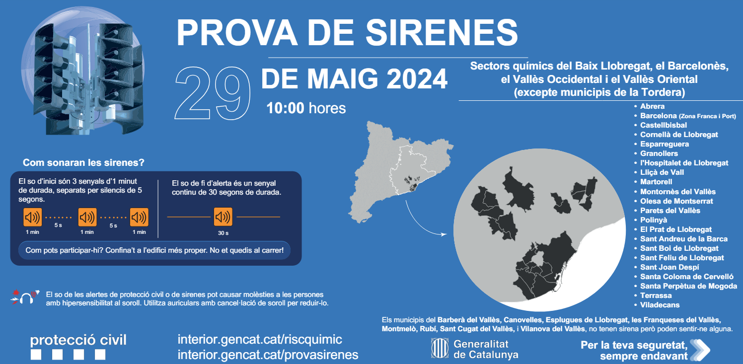 Protecció Civil de la Generalitat de Catalunya ha programat per al pròxim dimecres 29 de maig a les 10:00 hores, una nova prova de sirenes de risc químic, també anomenada Efecte Bombolla, de la xarxa d'alarmes i comunicacions adscrites al Pla d'Emergència Exterior del Sector Químic de Catalunya.