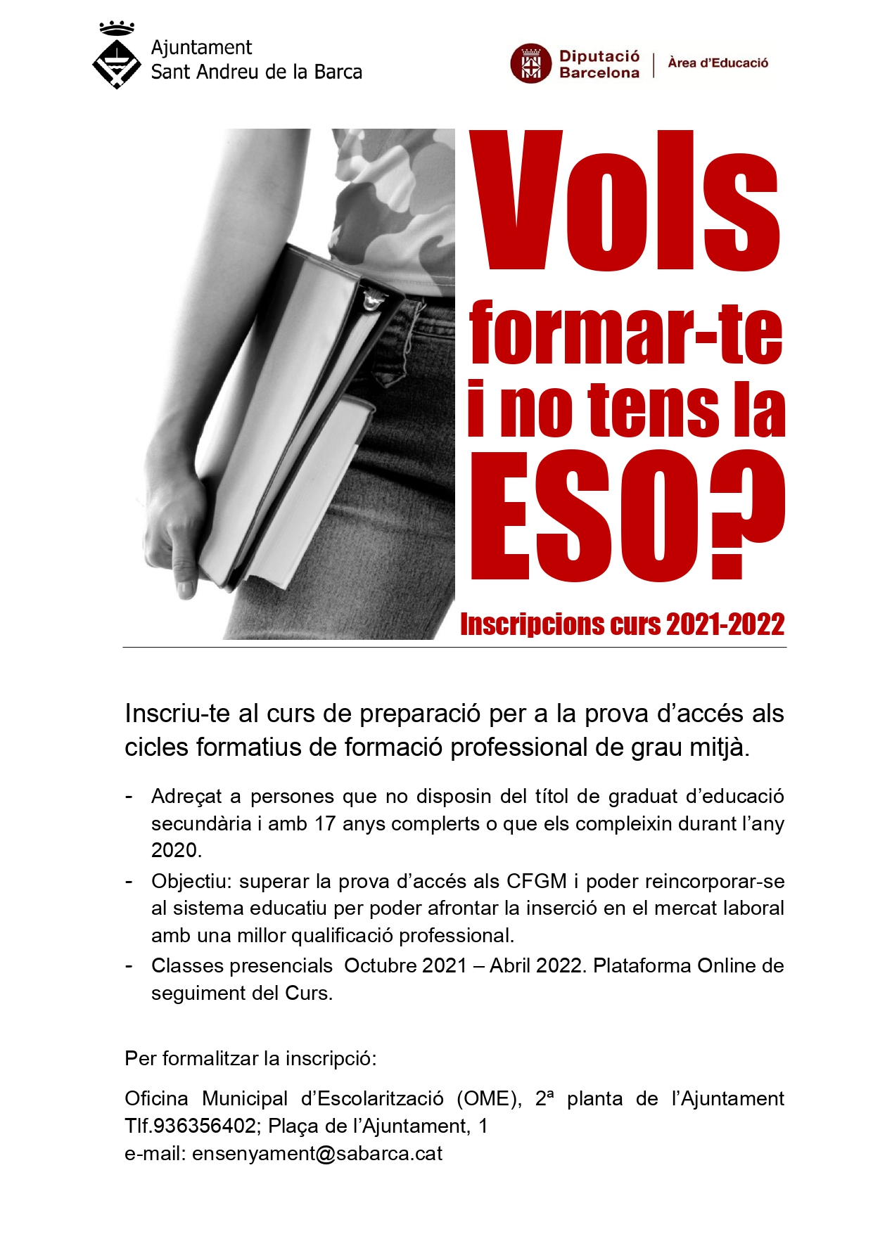 El tràmit d’inscripció al curs s’ha de realitzar telemàticament enviant un correu electrònic a ensenyament@sabarca.cat o a través del següent enllaç: https://sabarca.cat/tramits/129.