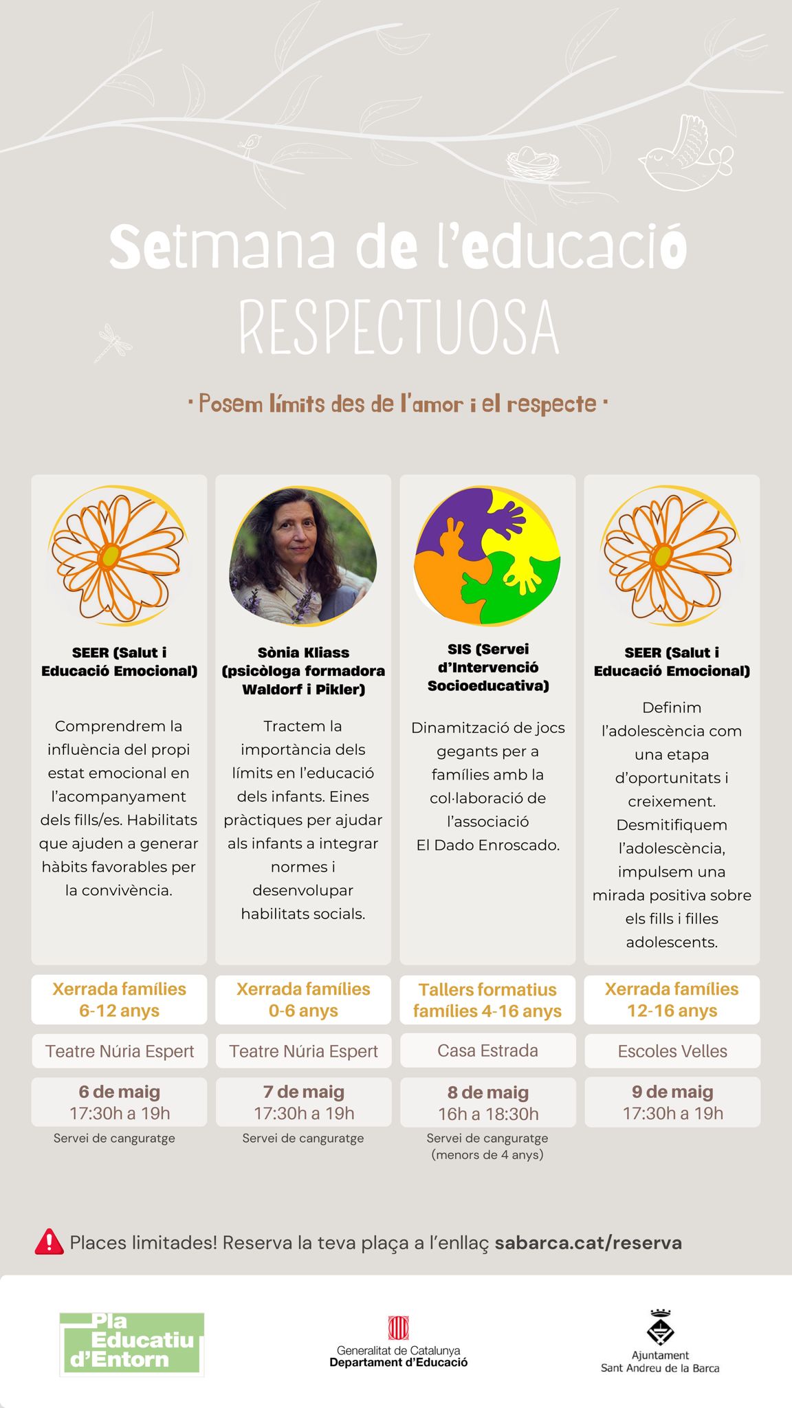La pròxima setmana Sant Andreu de la Barca celebra la Setmana de l'Educació Respectuosa, una campanya commemorada dins el Pla Educatiu d'Entorn del municipi. Del 6 al 9 de maig s'han preparat tallers i xerrades amb l'objectiu de potenciar la implicació de les famílies en l'educació dels seus fills i filles i la participació en la seva vida escolar.