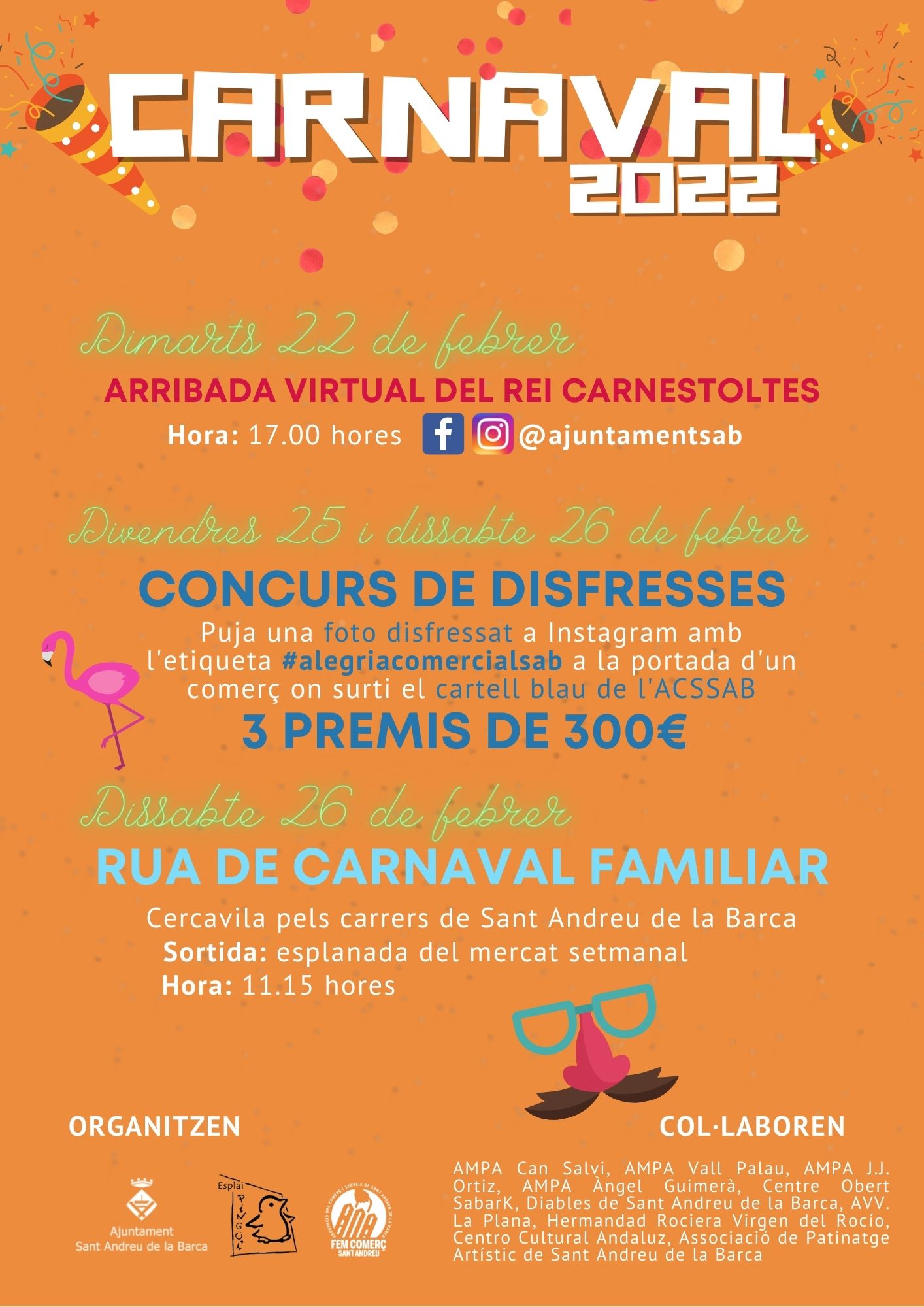 Una de les novetats del Carnaval d’enguany és el concurs de disfresses organitzat per l’Associació de Comerciants i Serveis de Sant Andreu de la Barca (ACSSAB). Aquesta iniciativa té com a objectiu fomentar la creativitat i la participació de la gent, així com també el comerç local.
