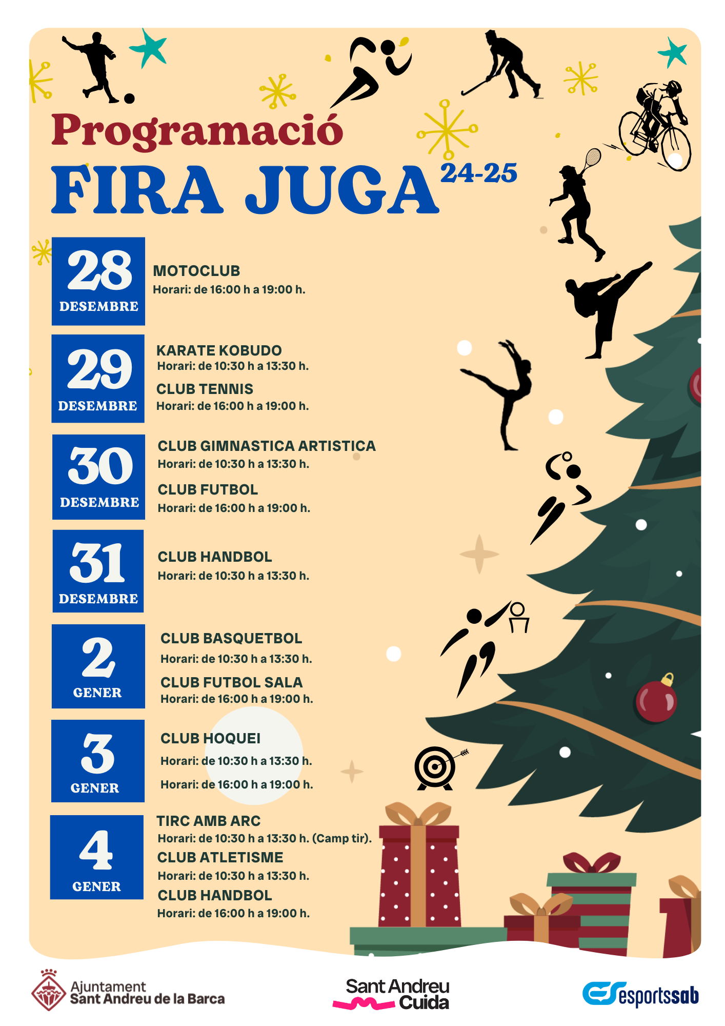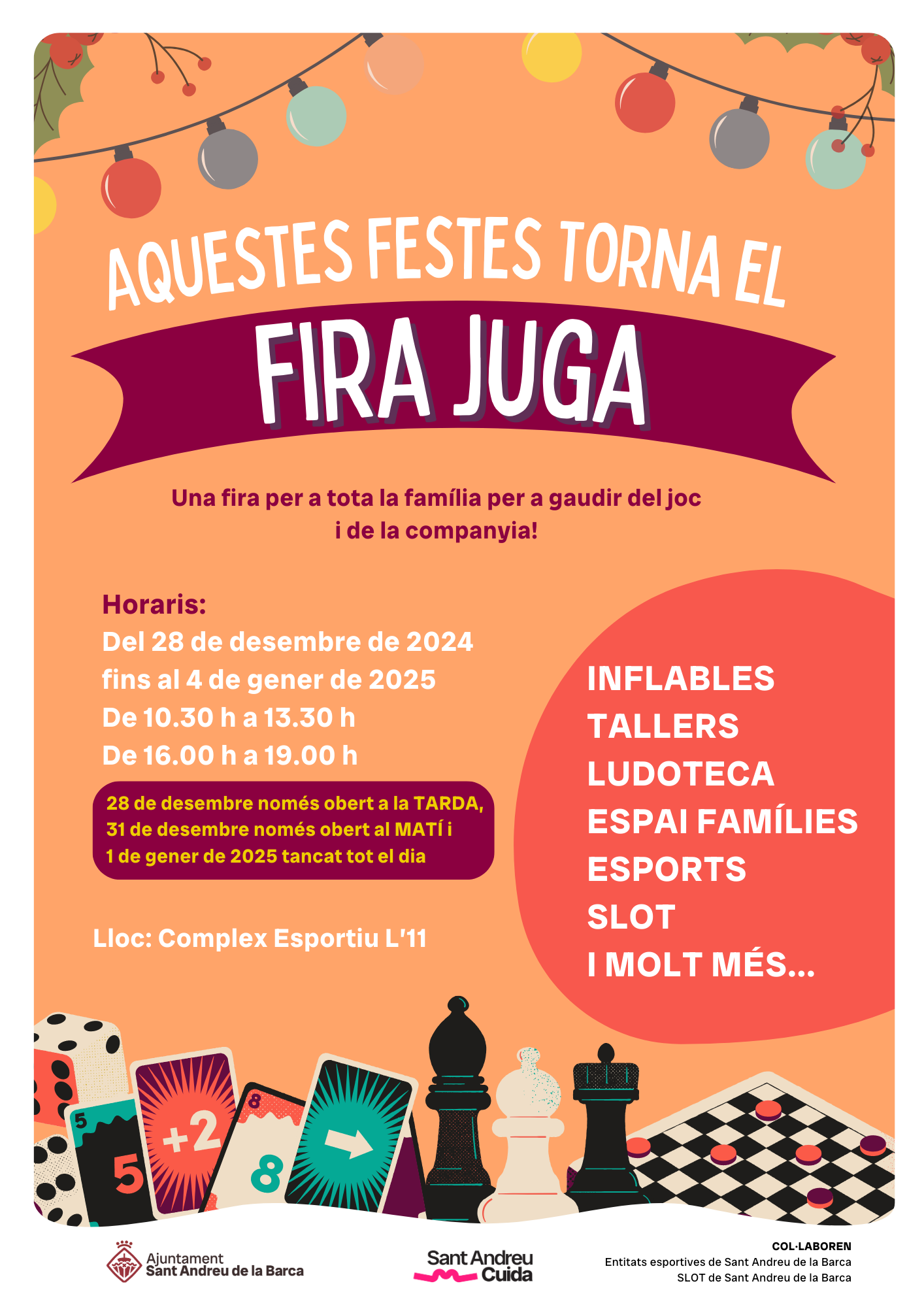 Del 28 de desembre al 4 de gener el poliesportiu acollirà aquesta fira infantil plena de jocs, inflables, esports, ludoteca i tallers per a infants de 0 a 12 anys. El servei es realitzarà amb monitors i monitores titulats i amb la col·laboració d’entitat esportives locals i l’associació lúdica Club SLOT Sant Andreu de la Barca.