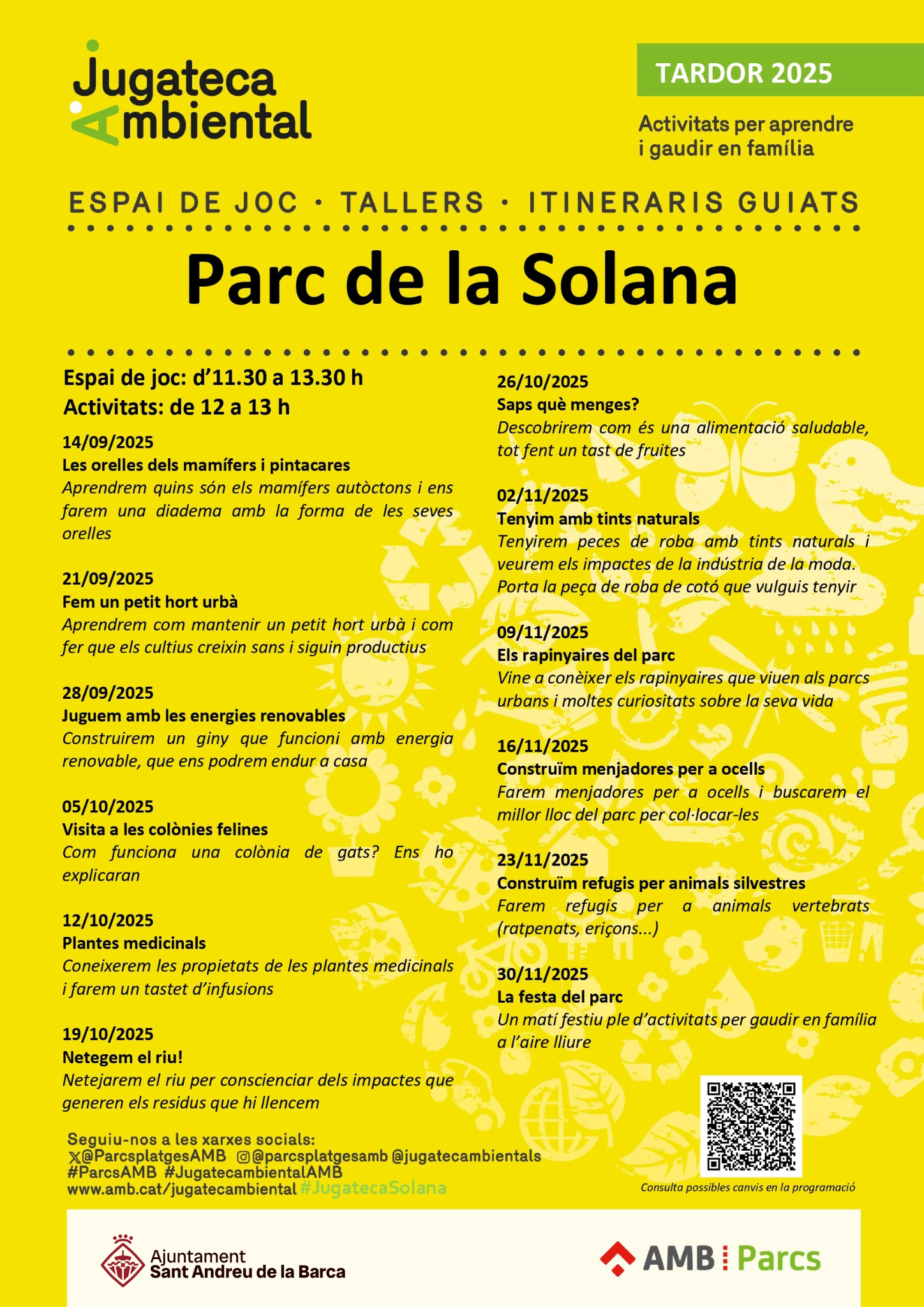 Fins al 30 de novembre, que serà l'últim, cada diumenge d'11.30 a 13.30 hores s'hi podran trobar diferents espais, un de joc lliure i un punt d'informació sobre el municipi i el parc, i una activitat guiada que cada setmana reflexionarà sobre un tema diferent relacionat amb la natura. A més, ofereix serveis i programacions per conèixer conjunts diferents continguts ambientals.