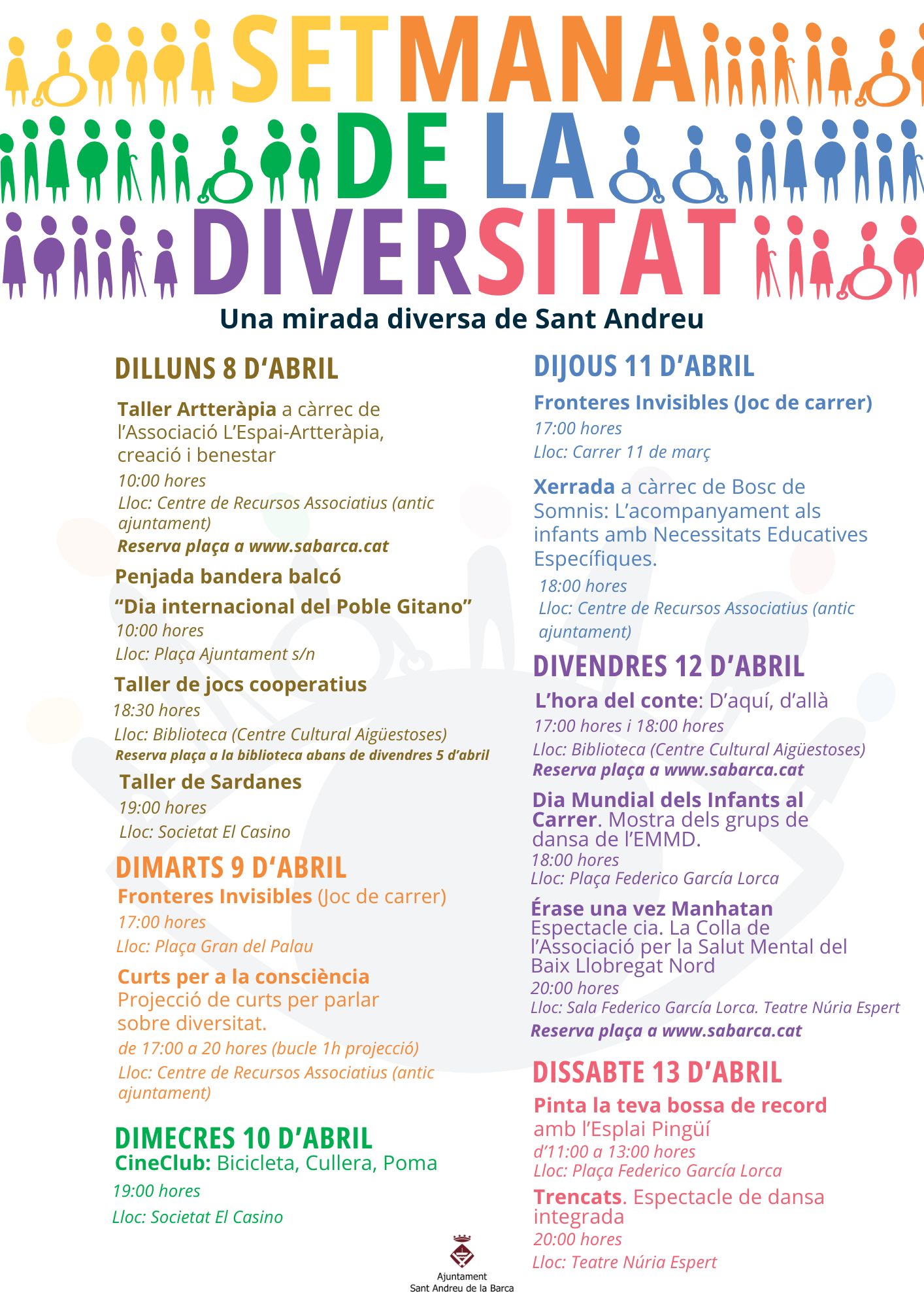 La setmana del 8 d'abril, Sant Andreu de la Barca celebrarà la Setmana de la Diversitat amb l'objectiu de visibilitzar, conscienciar i reflexionar sobre la diversitat, en el seu significat més ampli.