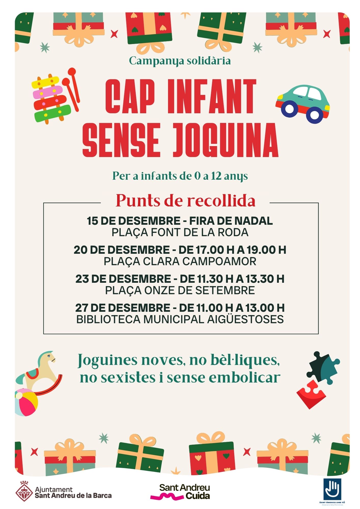 Un any més amb l’arribada de les festes nadalenques, Sant Andreu de la Barca organitza la campanya “Cap infant sense joguina” amb l’objectiu de recollir joguines per a infants d’entre 0 a 12 anys per a garantir que les famílies vulnerables del municipi puguin comptar amb una joguina per als més petits de la casa el dia de Reis.